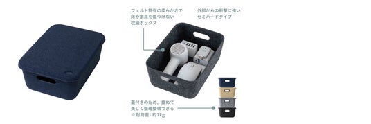 - フェルト特有のやわらかさで、床や家具を傷つけない収納BOX- コンパクトなデザインでクローゼットやハンガーラック、引き出しや卓上など、 さまざまなシーンで活躍