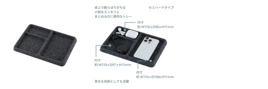 - スマートフォンやアクセサリー、小銭や鍵、腕時計やメガネなど日用品から、 ペンやクリップといったオフィス小物まで幅広いアイテムの収納に最適