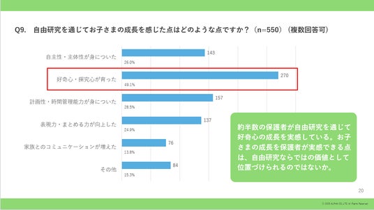 約半数の保護者が自由研究を通じて好奇心の成長を実感している。お子さまの成長を保護者が実感できる点は、自由研究ならではの価値として位置づけられるのではないか。