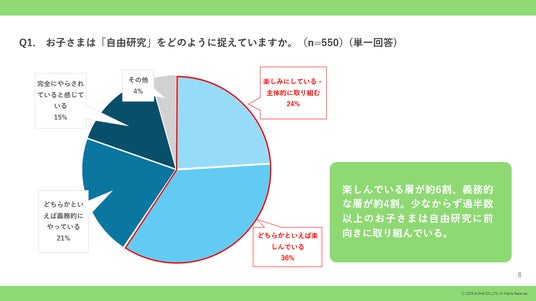 楽しんでいる層が約6割、義務的な層が約4割。少なからず過半数以上のお子さまは自由研究に前向きに取り組んでいる。