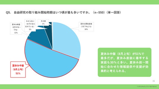 「夏休み中盤(8月上旬)」が51%で最多だが、「夏休み開始直後」に着手する家庭も30%と多い。夏休み前~開始に合わせた情報提供や支援が効果的と考えられる。