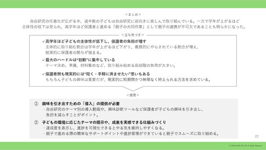 自由研究の任意化が広がる中、過半数の子どもは自由研究に前向きに楽しんで取り組んでいる。一方で学年が上がるほど主体性の低下は見られ、高学年ほど保護者と進める「親子の共同作業」として親子の連携が不可欠であることも明らかになった。
