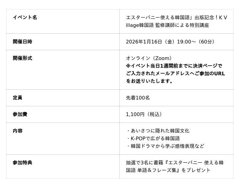 日本最大級の韓国語教室「K Village 韓国語」を運営する株式会社K Village(本社:東京都新宿区、代表取締役社長:桑原 元就)は、韓国好きのためのコミュニティアプリ「K Village MODULY」ユーザー向けに、監修を担当した韓国語学習書『エスターバニー 使える韓国語 単語&フレーズ集』(KADOKAWA)の発売を記念し、2026年1月16日(金)に特別オンラインイベントを開催いたします。