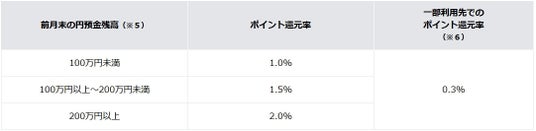 デビット利用月の前月末の円預金残高に応じて、デビットカードの利用額※4に対して最大2%のカテエネポイントを還元いたします。