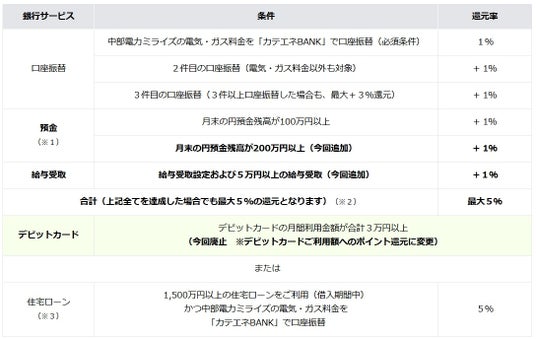 カテエネBANKでは、銀行サービスの利用状況に応じ、毎月、中部電力ミライズの電気・ガス料金のお支払い額の最大5%がカテエネポイントで還元されます。このたび、新たに預金と給与受取の条件を追加いたします。現行のプログラムにおけるデビットカードの利用条件は廃止となりますが、1月1日よりデビットカードはご利用額に対して最大2%のカテエネポイントを進呈いたします。(2.参照)。