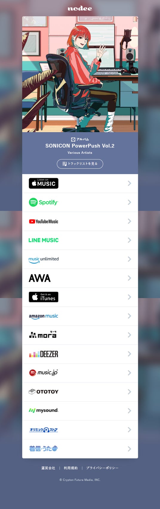 クリプトン・フューチャー・メディア株式会社(本社:北海道札幌市、代表取締役:伊藤博之、以下クリプトン)は、2025年12月17日(水)付けで、リンクまとめサービス「nodee(ノーディー)」を一般公開いたしました。シェアしたい曲名やアーティスト名を検索することで、その曲が配信されている各種音楽サービスへのリンクがまとまったページを簡単に取得できるサービスです。1億曲以上の音楽作品を網羅しているため、音楽サービスで配信されている楽曲であればジャンルを問わず見つかります。皆さまの“推し曲”をシェアする新ツールとして、ぜひお役立てください。