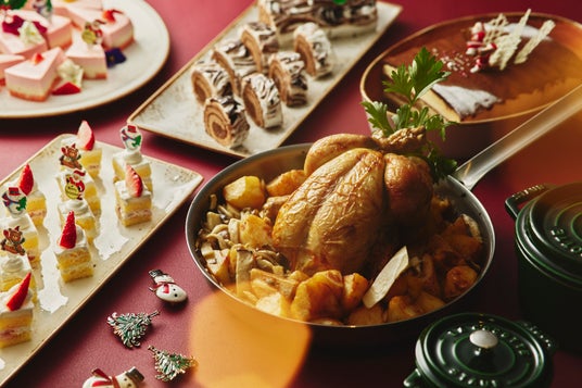 シェフ特製ローストチキンや季節の食材を使った贅沢なメニューが並びます。前菜からデザートまで彩り豊かな料理に加え、クリスマスケーキやスイーツ、和食やフレンチもラインナップ。ライブキッチンでは、人気の上州牛ローストビーフを目の前で仕上げるパフォーマンスもお楽しみです。