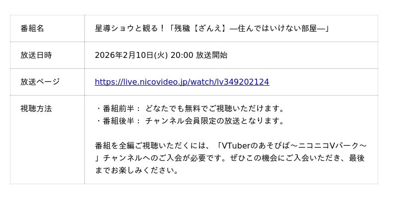 株式会社ドワンゴが運営するニコニコ公式チャンネル「VTuberのあそびば~ニコニコVパーク~」の人気生放送番組「VTuberと観る!映画実況シリーズ」に、にじさんじ所属 星導ショウの出演が決定いたしました。