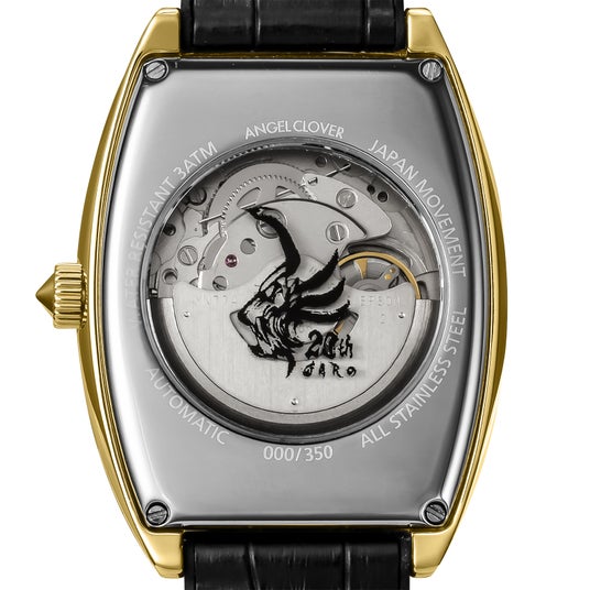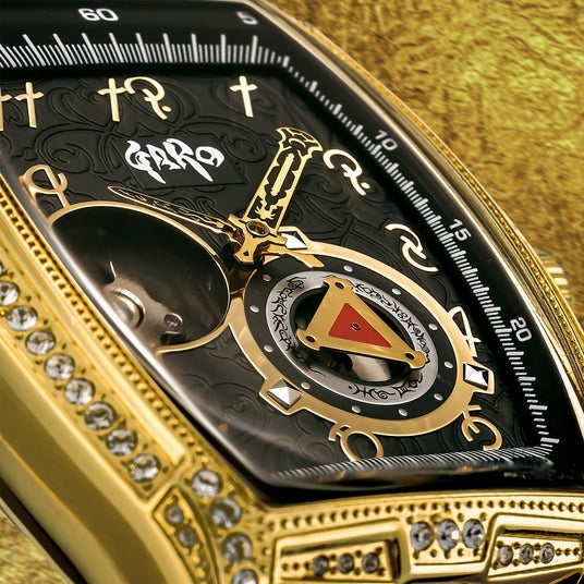 直線と曲線が交錯するトノー型のフォルムにより、鎧を思わせる重厚な造形と、騎士としての美しさを両立。ゴールドカラーのケースが放つ存在感は、一目で牙狼とわかる圧倒的な力強さを腕元に刻み込みます。日常使いとしてはもちろん、限定350本という希少価値の高い1本だけに、ぜひこの機会をお見逃しなく。