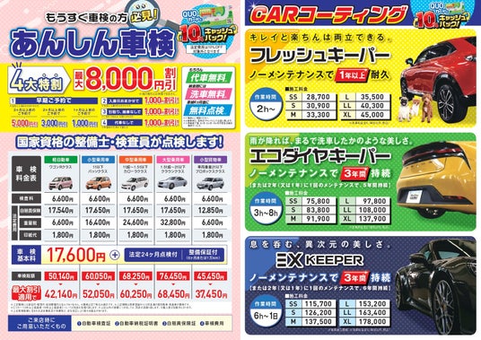 対象商品:タイヤ、コーティング、車検(法定費用除く)、オイル交換、その他のカーケア商品 など