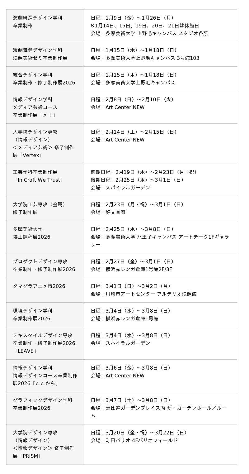 また、学内展のほかに、各学科・専攻・コース独自の展示等も2025年12月を皮切りに都内および神奈川県内のアートスペース各所で行われます。