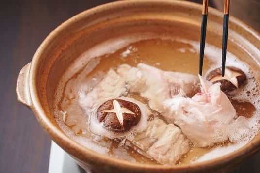 とらふぐのあらで仕立てる本場下関流のふくちり。川棚グランドホテルお多福ではおもてなし係がお客様の目の前でお作りし、一番美味しいタイミングでお取り分けいたします。とらふぐと地野菜の旨味がたっぷり溶け込んだお出汁で仕上げる雑炊は、とらふくフルコースを締めくくる至福の味。