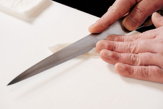 畑水産で丁寧な活かし込みを行い、身欠かれ、選定された質の高いとらふぐは、三日間の熟成期間を経てふくさしの身が完成します。寝かせることで旨味を増していくふぐの身。成熟したふくの旨味としっかりとした食感を大切に、調理人がやや厚めに引いていきます。