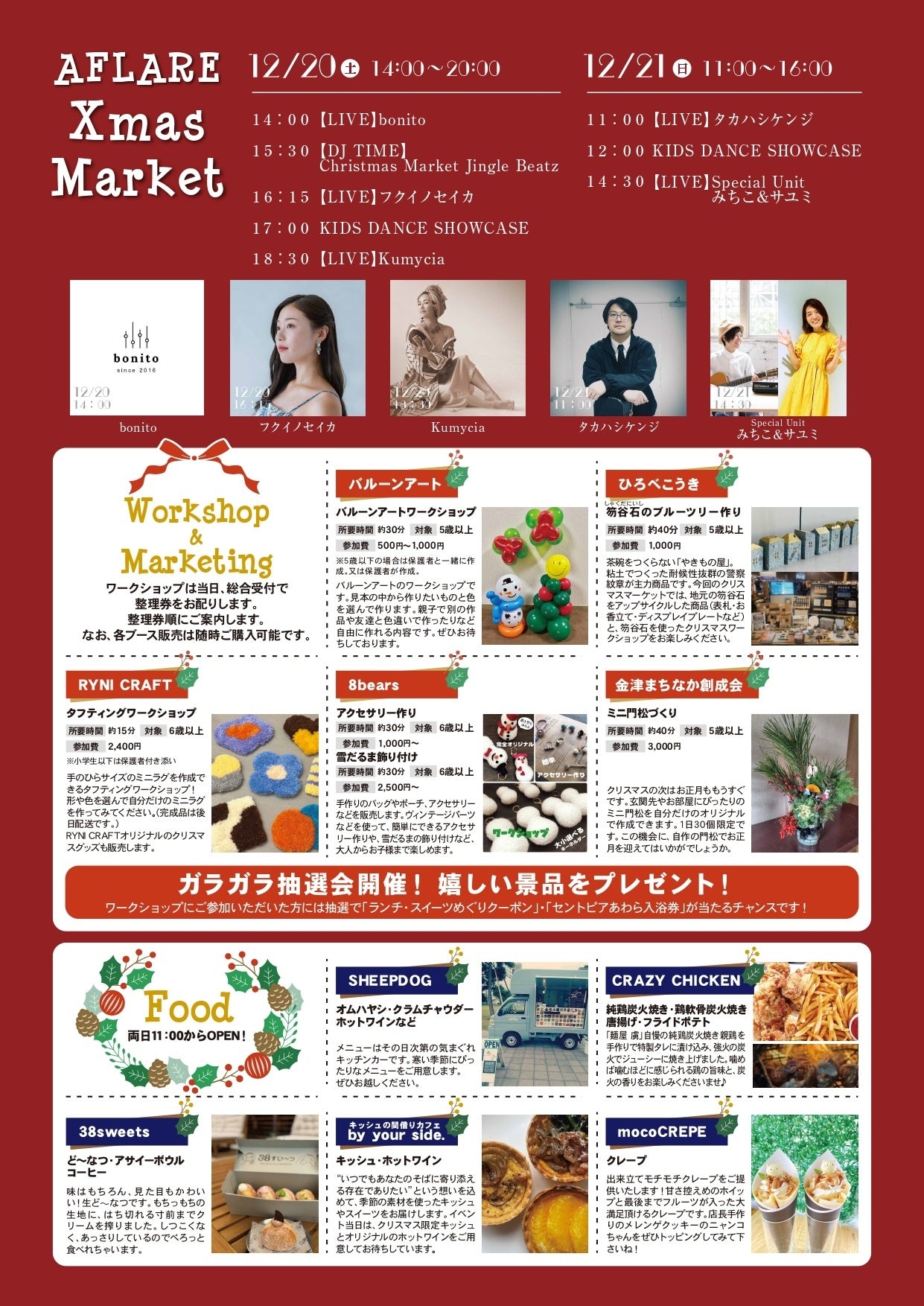 福井県あわら市の芦原温泉駅西口賑わい施設「アフレア」にて、クリスマスの雰囲気を満喫できるイベント「AFLARE Xmas Market」を12月20日(土)・21日(日)の2日間開催します。地元アーティストによる音楽ライブやキッズダンスをはじめ、ハンドメイド雑貨のマーケットや雪だるま雑貨の飾り付け体験などのワークショップ、寒い季節にぴったりのグルメがアフレアに集結。家族や友人と一緒に楽しめる、特別なひとときをお届けします。
