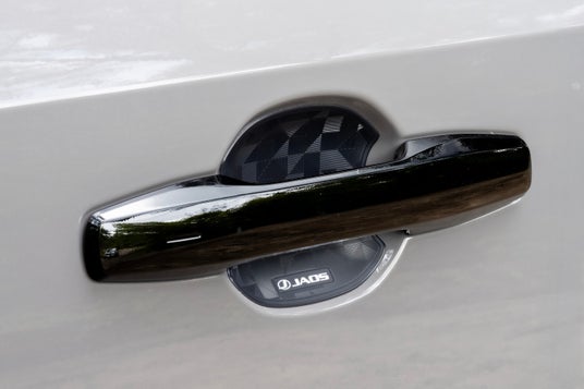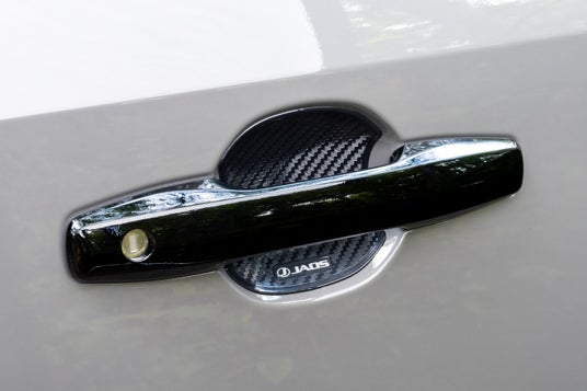 開閉時に爪で傷をつけてしまいがちなドアハンドル周辺を保護する樹脂製プロテクター。ワンポイントドレスアップとしても効果的。