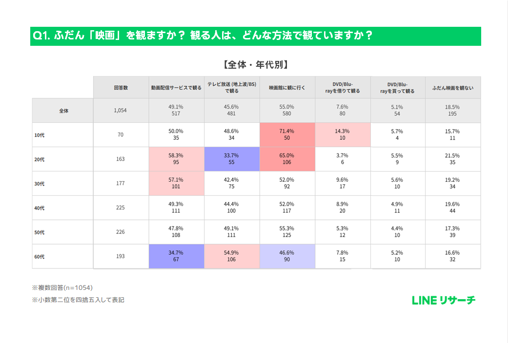「映画館に観に行く」が55.0%で最多。10代71.4%、20代65.0%と若年層で高めの傾向。