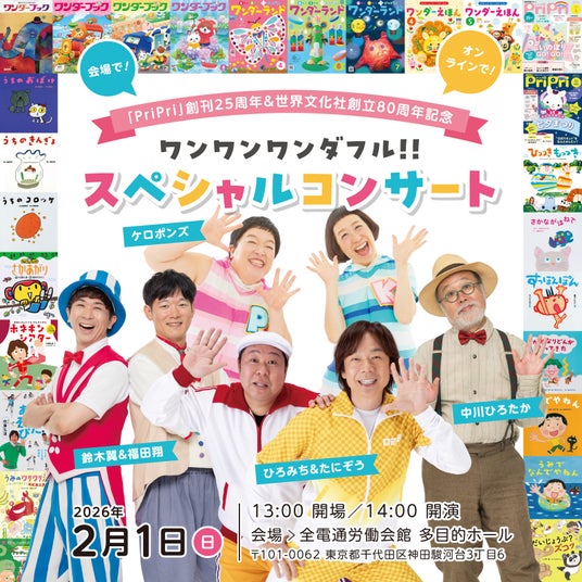 世界文化ワンダーグループ(本社:東京都千代田区)は、『PriPri』創刊25周年、および世界文化社グループの創立80周年を記念し、2026年2月1日(日)、ワンダーにもゆかりの深いトップアーティストとともに、親子で楽しめるスペシャルコンサートを開催します。