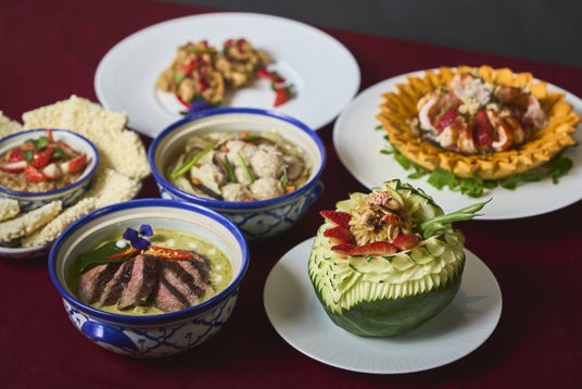 ライスクラッカー&チキン・シュリンプ 苺ソース、スパイシーシュリンプの苺サラダ、パパイヤと苺のサラダ、豚団子入り椎茸スープ、ビーフグリーンカレー、クリスピーチキン 苺とハニーソース、ジャスミンライス、ビーフタイヌードル