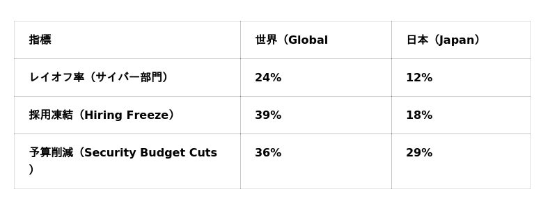 一方、日本市場には世界と異なる特徴も見られました。過去12カ月の間に、サイバーセキュリティ分野におけるレイオフ経験者はわずか12%、採用凍結は18%、予算削減経験は29%と、いずれも世界平均を下回り、雇用環境は比較的安定しています。