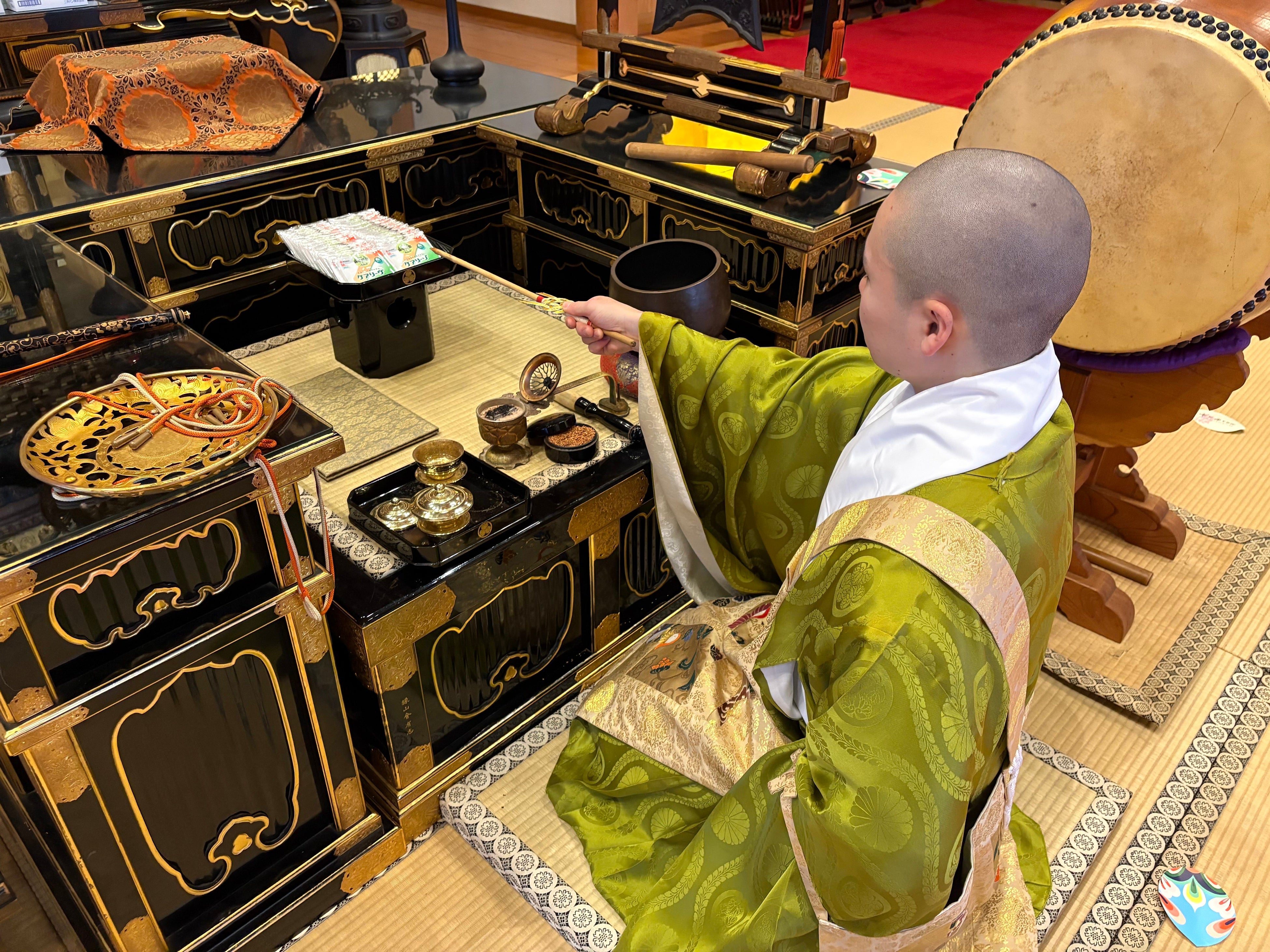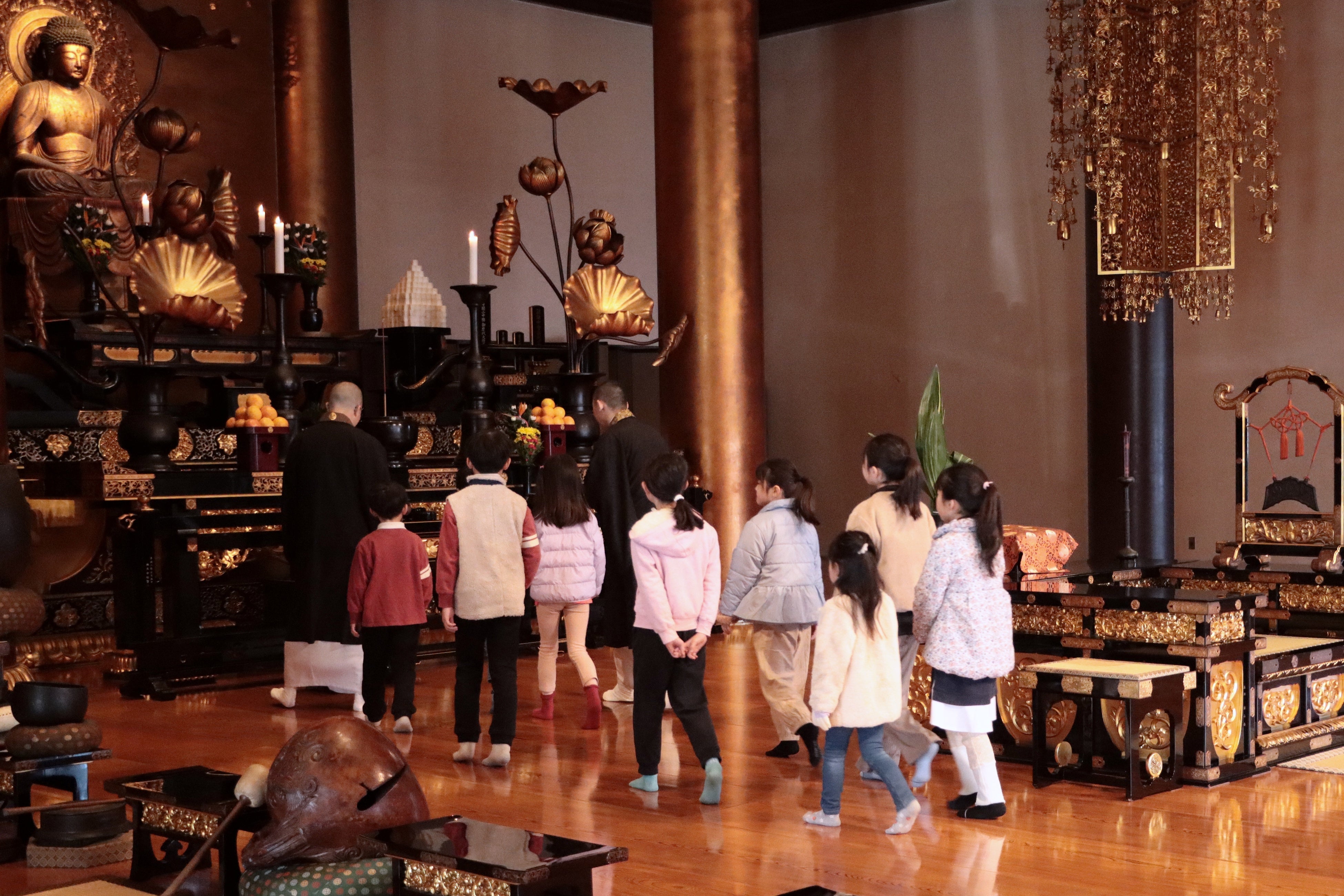 大殿では、周辺の手すりを拭く作業を、圓光大師堂では、雑巾で畳一枚一枚を丁寧に拭く作業のほか、お経を僧侶と一緒に唱えたり、木魚や磬子(けいす)などの道具を鳴らしてみたりと、日常ではなかなかできない貴重な体験をすることができました。子どもたちは「畳を拭くのは初めて!」「お坊さんになったみたいで楽しい!」と新鮮な様子で取り組んでいました。
