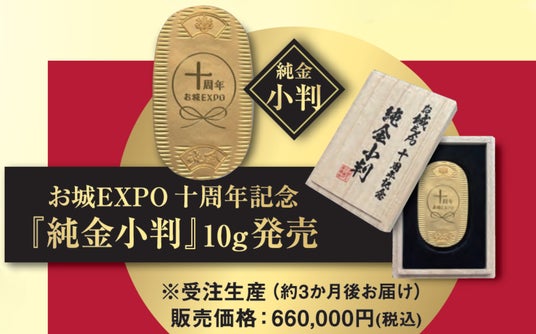 お城EXPO10周年記念の『純金小判』を発売します。10周年を記念して、重さは10g。桐箱に入った高級感あふれるオリジナルデザインの小判です。
