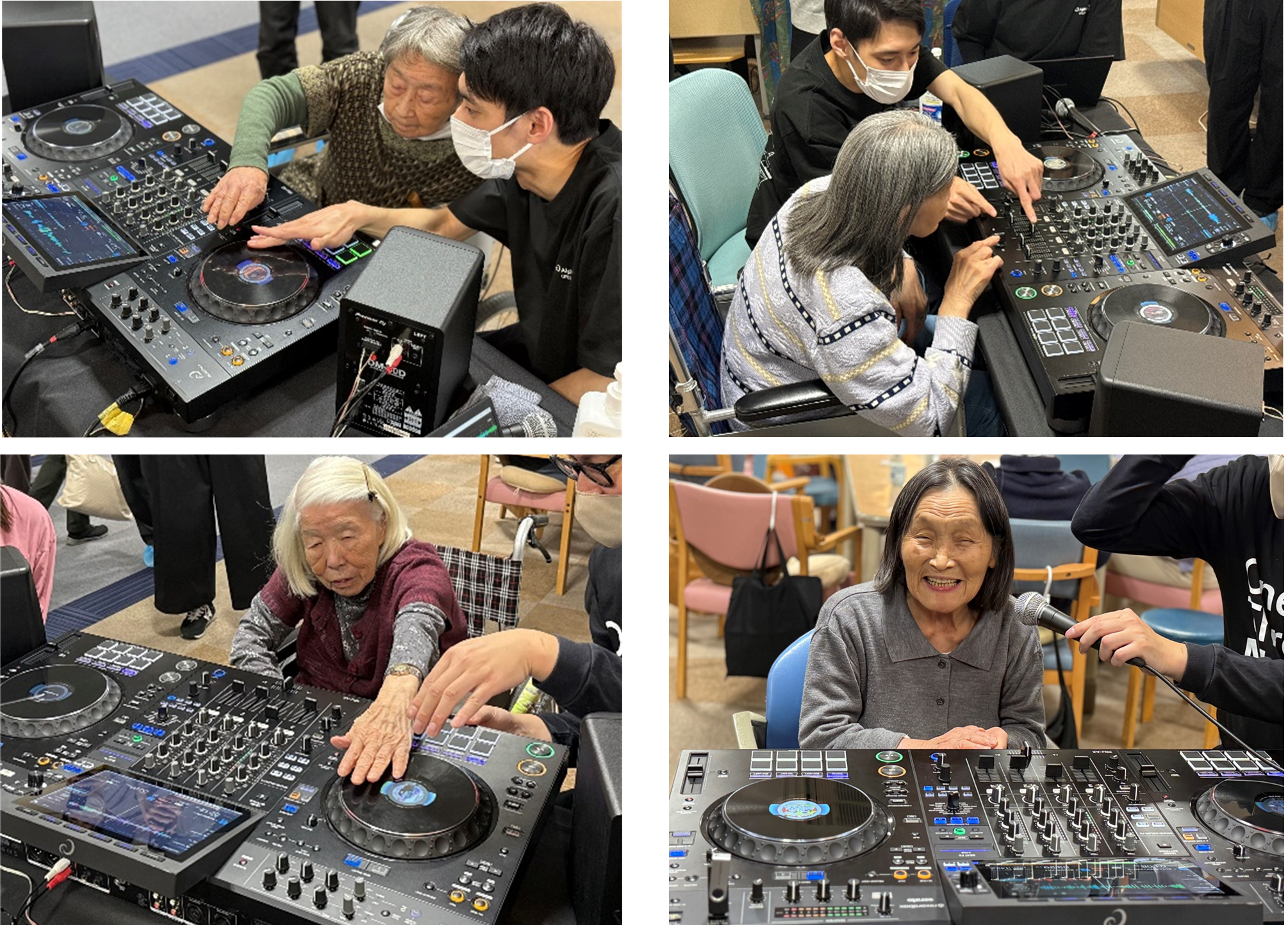 DJ体験ブースには、DJ機器から直接Apple Musicにインターネットを介して接続可能な4ch プロフェッショナル オールインワン DJシステム「XDJ-AZ」を設置。当日は施設を利用する高齢者がDJ体験ブースに訪れ、初めて触れるDJ機材に興味深そうに手を伸ばす姿が見られました。参加者の中には、97歳の方が生まれて初めてDJに挑戦する場面もあり、「この歳になっても新しいことに挑戦できてうれしい」といった声が聞かれました。
