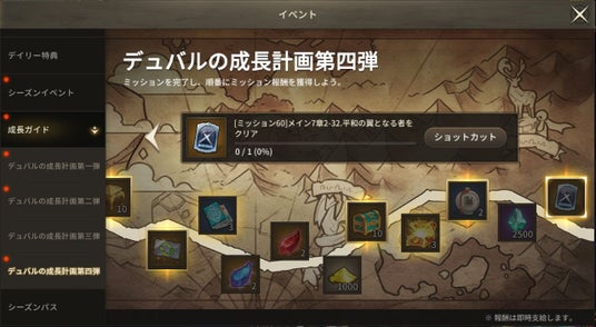 イベント期間中に用意された全21ミッションを達成することで、非常に入手難度の高い「神話武器外見召喚券(キャラクター)1個」を獲得できます。