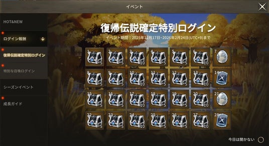 一定期間ゲームをプレイしていない復帰者を対象に、特別なログインイベントを開催します。本イベントでは、ログインすることで「伝説バディ選択卵」2個と「伝説武器外見選択召喚券」2個、合計4点の伝説級アイテムを獲得できます。