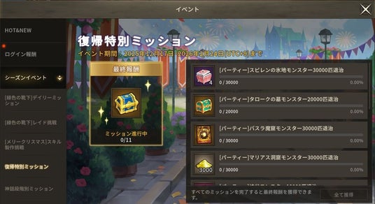 イベントでは、ゲーム内ミッションの達成により希少性の高い「神話武器外見召喚券(キャラクター)」を獲得できるほか、ログインやプレイを通じて集めた専用トークンを、さまざまなアイテムと交換できます。さらに今回のアップデートでは、各職業に新たな補助職業を追加するなど、キャラクター育成と戦略性を拡張する要素を実装しました。年末年始に向け、より深く遊び込める内容となっています。