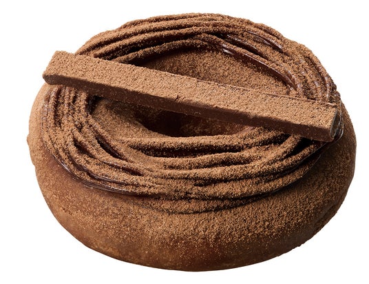 『生チョコ モンブラン』は、贅沢に絞った生チョコ入りクリームを楽しむモンブランケーキのようなドーナツです。チョコ生地のドーナツに、生チョコを練り込んだなめらかなチョコクリームをモンブラン風にぐるっと絞り、真ん中にパリッとした食感のビターな板チョコをのせました。仕上げにココアシュガーをかけて、冬らしい仕上がりに。チョコレート好きにおすすめしたい、濃厚なチョコレートの味わいを楽しむことができる商品です。