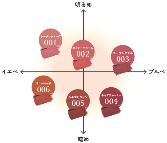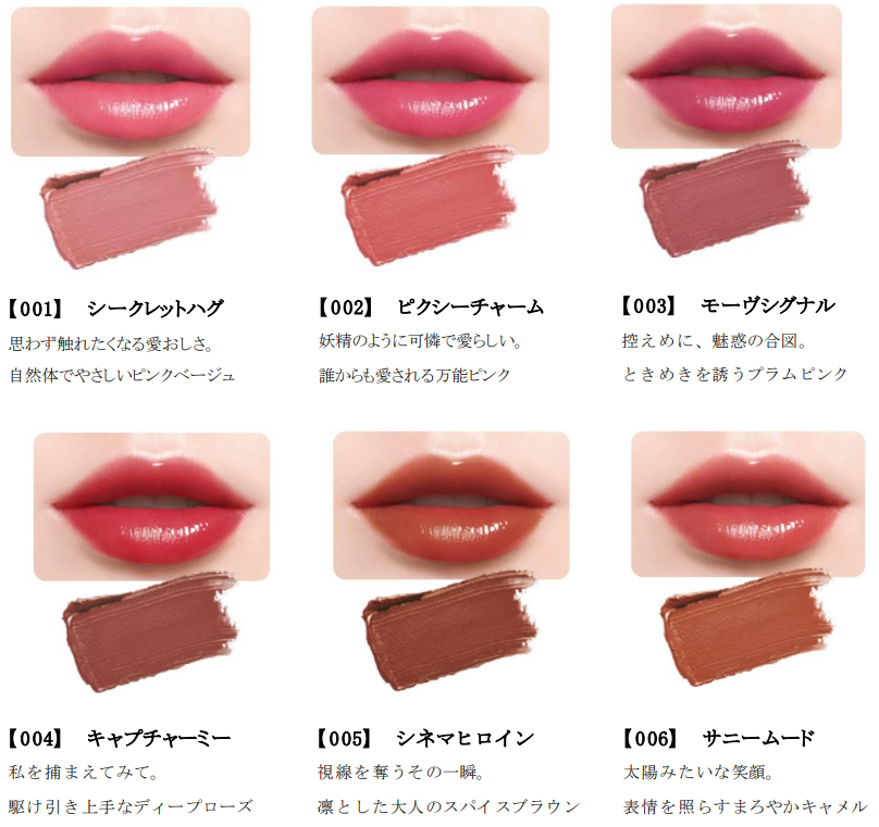 1.自分にぴったりの血色感が見つかる 6色の高発色粘膜カラー仕上がりイメージ