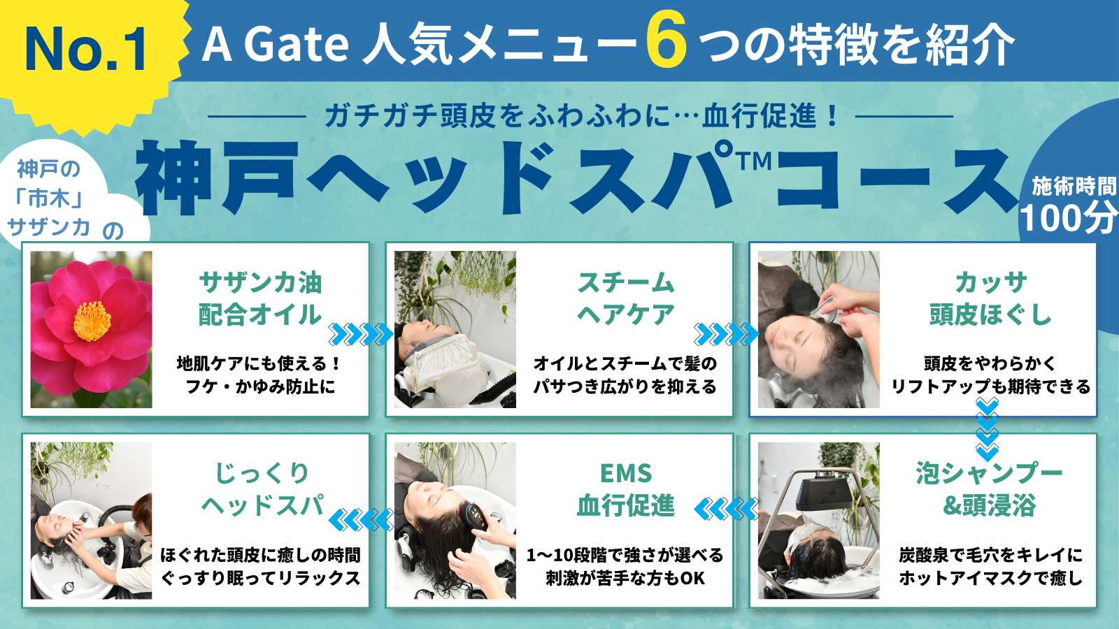 「A Gate ヘッドスパ専門店」の2周年を記念して誕生したメニューで、神戸市の「市民の木」(市木)である「サザンカ」の成分を含むオイルを使用した施術を行うことから『神戸ヘッドスパ(TM)コース』と命名しました。