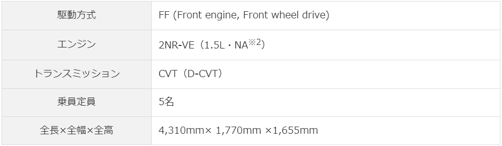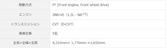 2NR-VEエンジン(1.5L)を搭載し、力強い走りを実現すると共に、DNGA Bセグメント用プラットフォーム、D-CVTを採用し、優れた車内の静粛性、燃費性能を実現