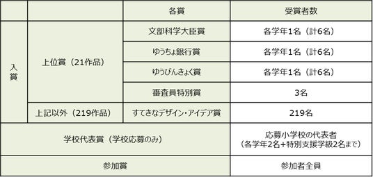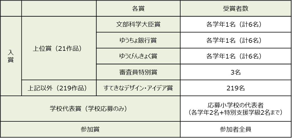 2025年11月20日(木)に東京都内で最終審査会を実施し、応募作品の中から、一次審査で選ばれた優秀作品(240点)の最終審査を行い、「文部科学大臣賞」、「ゆうちょ銀行賞」、「ゆうびんきょく賞」(各6名)、「審査員特別賞」(3名)、「すてきなデザイン・アイデア賞」(219名)の受賞者を決定いたしました。