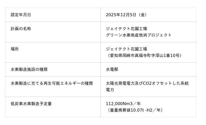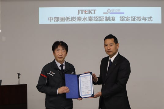 株式会社ジェイテクト(本社:愛知県刈谷市、取締役社長:近藤 禎人)の花園工場(愛知県岡崎市)における「グリーン水素地産地消プロジェクト」が、「中部圏低炭素水素認証制度」に基づき認定され、12月17日に事業計画の認定証が交付されました。