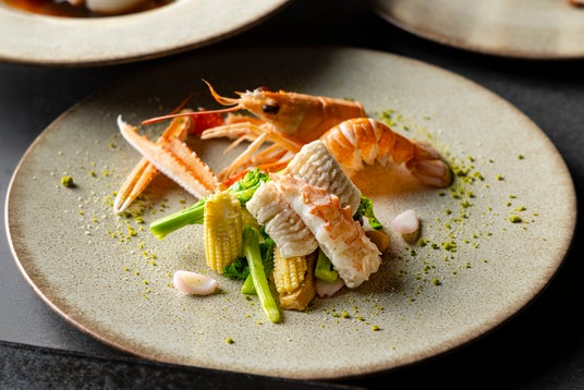 ・長崎県対馬産穴子と手長海老の炒め 壱岐産オリーブパウダーを散りばめて ~長崎~