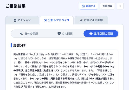 「教えて!排泄ケア」は、体調の変化やどういうケアをすべきかなどの悩みに対し、服薬情報、既往歴、日常生活動作の能力、排泄に関する情報などの断片的な情報から統合的に分析し、課題の背景にある複数の要因を「影響分析&アドバイス」として網羅的に整理した上で、具体的な対策を複数提案します。ベテラン職員のように広い視野で仮説を立て、具体的な対策を検討できるようになることで、施設全体のケアレベルの底上げを実現します。