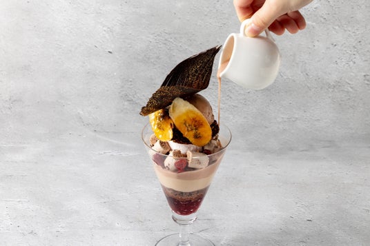 濃厚なチョコレートと芳醇なポートワインを重ね、バレンタインシーズンにふさわしい華やかなパフェに仕立てました。チョコバニラアイスやバナナキャラメリゼのまろやかな甘さに、クランベリーやチェリーのフルーティーな酸味がアクセントを添えます。グラスの中には、赤ワインゼリーやショコラモンテ、カカオニブのシュトロイゼルなどを重ね、さまざまな味わいと食感をお愉しみいただけます。仕上げにポートワインとバナナを合わせた香り豊かなソースをかければ、一口ごとに移ろう風味を感じられます。