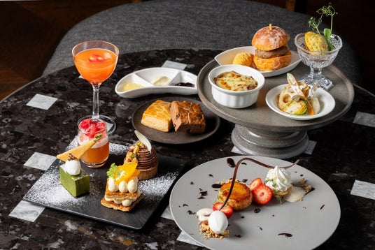 オークラ東京のパティシエが贈る、コース仕立ての特別なアフタヌーンティー。セイボリーには、茄子のグラタンや季節野菜のローストなど、寒い季節に心温まる品々をご用意しました。スイーツでは、チョコレートタルトの上に仕立てたモンブランや、せとかの甘みを感じるミルフィーユなど、濃厚さと爽やかさの両方をお愉しみいただける4種類を取り揃えています。締めのアシエットデセールは、シュー生地の中に苺ジャム、マスカルポーネクリーム、エスプレッソのカスタードを忍ばせました。エスプレッソの泡とソースと合わせると、ティラミスへと仕上がる一皿です。味わいの変化を体験しながらお愉しみいただけます。