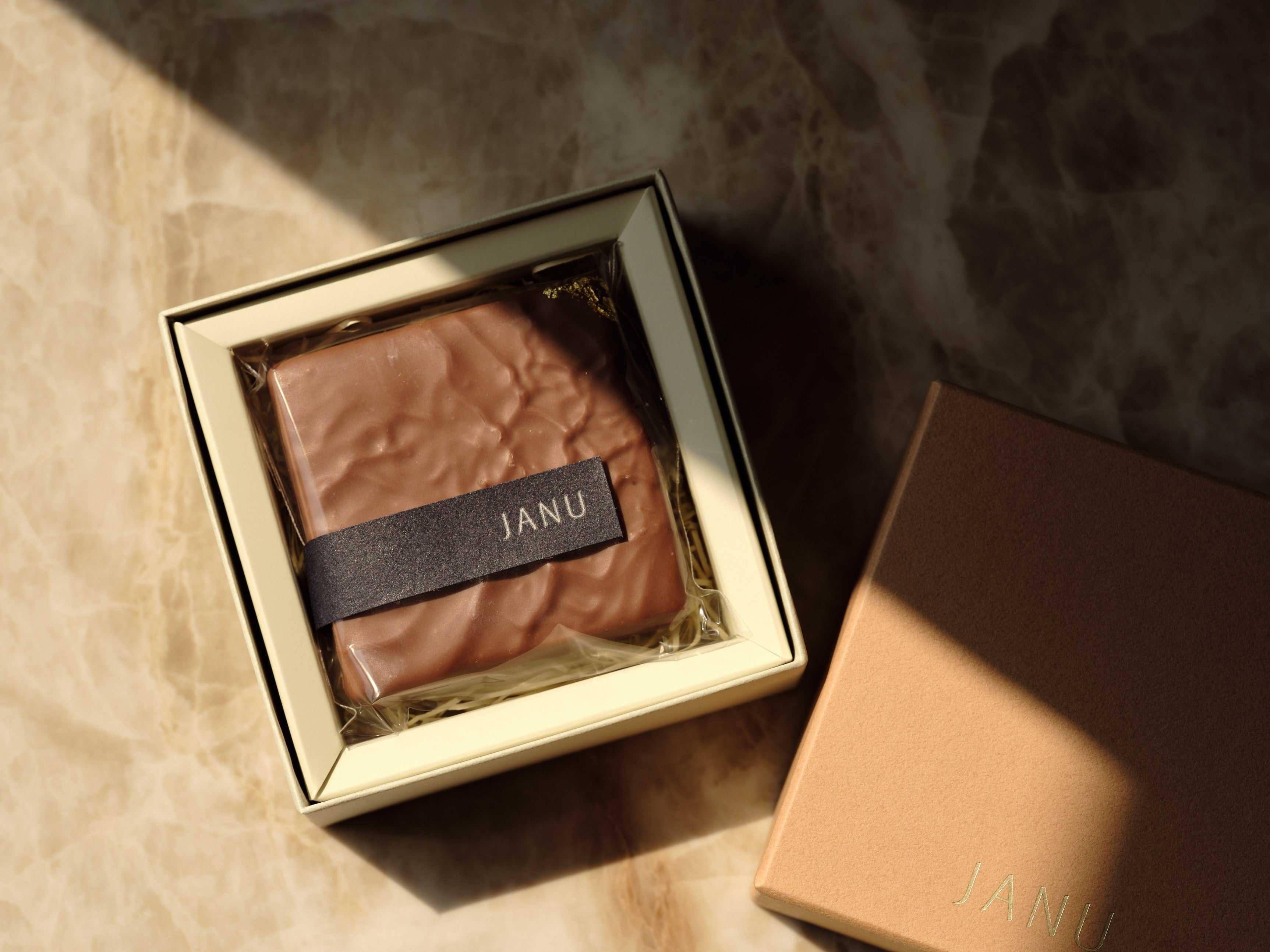 ジャヌ東京のジャンドゥーヤは、アーモンドとヘーゼルナッツのプラリネとバニラを合わせ、ナッツ本来の香ばしさと食感を大切に仕上げました。なめらかなチョコレートの中に、砕いたナッツの歯ざわりがほどよいアクセントとなり、ひと口ごとに香ばしさが広がります。やさしい甘さの中にほろ苦さが重なり、慌ただしい日々の隙間にゆっくりと味わいたくなる一品です。