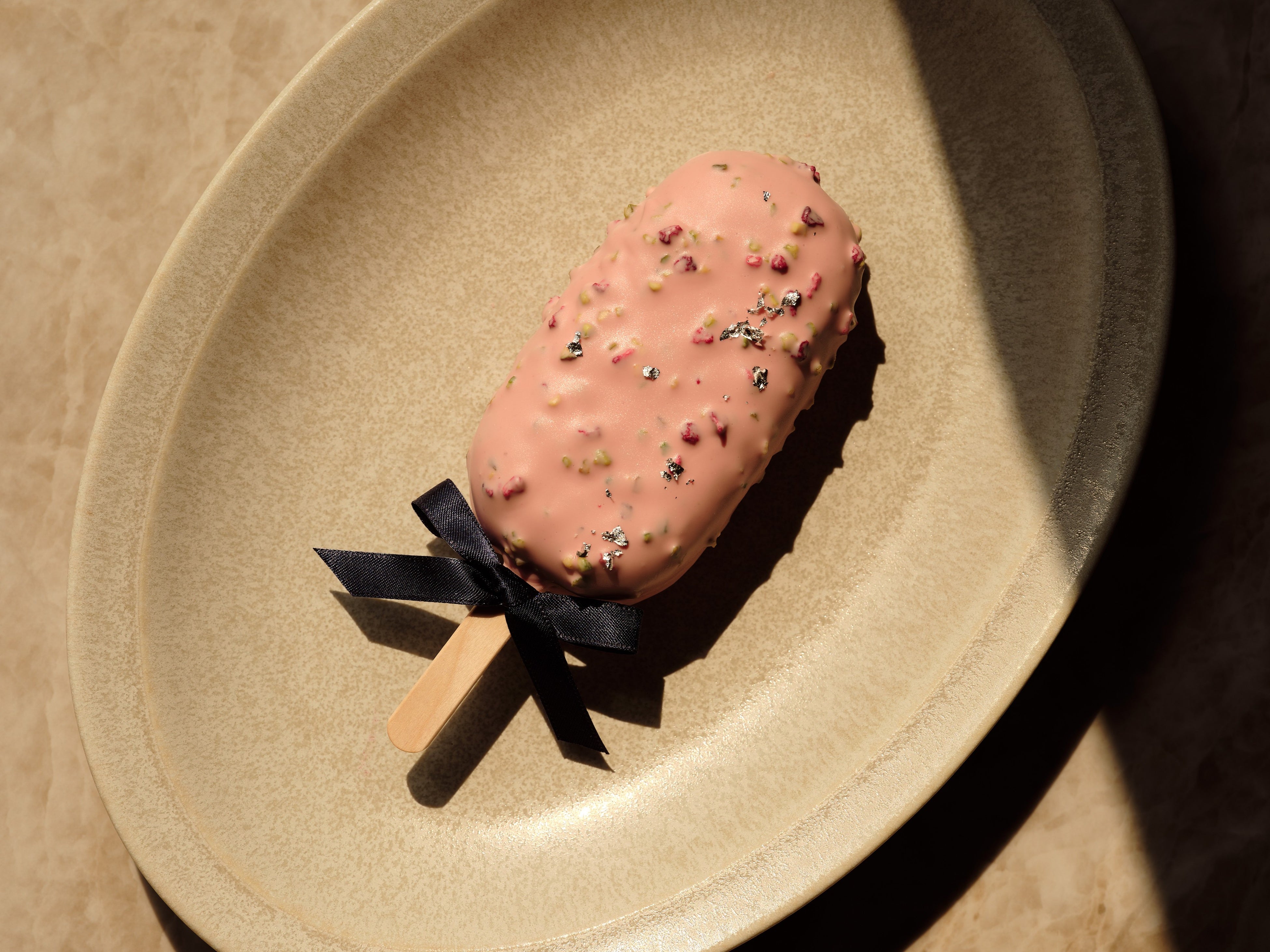 アイスクリームバーをモチーフにした、手持ちで楽しめるスイーツ「ジャヌポップ」が、期間限定で登場します。濃厚なラズベリーガナッシュとアーモンドビスキュイに、ラム酒シロップに漬けたレーズンやクランベリー、アプリコットなどのドライフルーツとアーモンドを合わせ、ピスタチオクランチとフリーズドライのラズベリーをまぶし、ラズベリーチョコレートでコーティング。仕上げに銀粉をあしらいました。ひと口ごとに、食感や風味が折り重なり、甘みと酸味のバランスが心地よく広がります。食べ進むほどに、いつのまにか自然と気持ちがほどけていくような、満足感のある一品です。