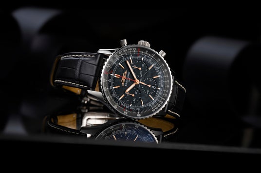 ブライトリングのアイコニックなクロノグラフ、ナビタイマー。ブランドの象徴たるコレクションから、ブラックのマザーオブパールダイヤルにブラックのサブダイヤルを組み合わせたオールブラック仕様が登場。天然素材ならではの神秘的な煌めきは、ゴールドカラーの針とインデックスと美しく調和し、唯一無二の存在感を放ちます。