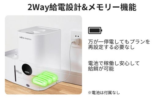 l デュアルモードの冗長電源システム:本製品は、「DCアダプター給電+内蔵大容量バックアップバッテリー」という2重の電力供給方式を採用。これにより、万一の停電時にも給餌機能が継続され、ペットの食事を確実に守ります。