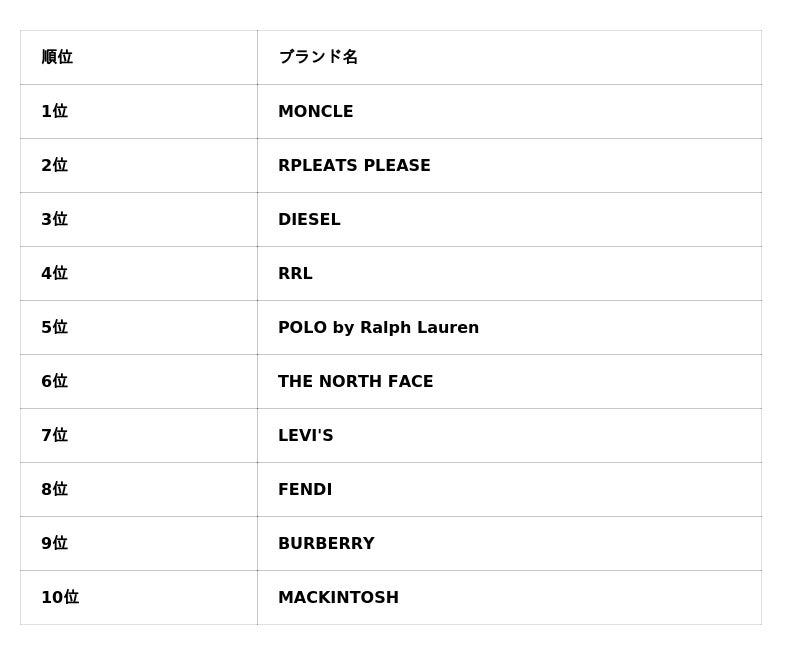 その結果、「MONCLER」「PLEATS PLEASE」「DIESEL」などの定番人気ブランドに加え、「RRL」「POLO by Ralph Lauren」「MACKINTOSH」といったクラシック・実用性の高いブランドも上位にランクインしました。