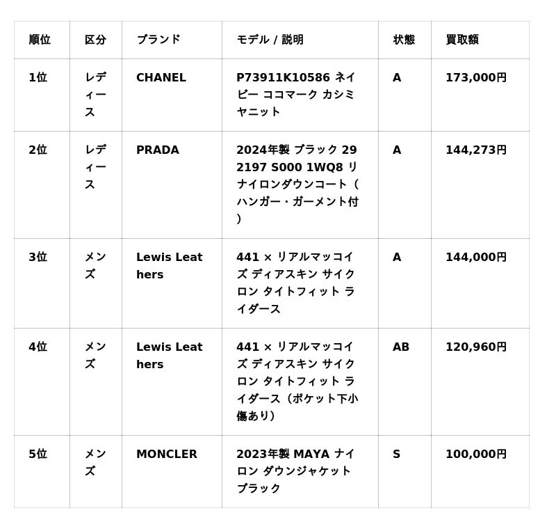 高額査定では、状態の良いトップスやアウター類、希少性の高いコラボモデルが上位を占める結果となり、洋服においてもコンディションとモデル価値が査定に大きく影響することがうかがえます。