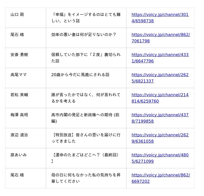 スタッフを入れずに、喋り手の方が自分の力でトークされているので個性が溢れ出ていて、純粋な人間性が出るのがVoicyのコンテンツの魅力だと思います。喋るのが楽しい!聴くのが楽しい!という文化がさらに伸びていって欲しいです!