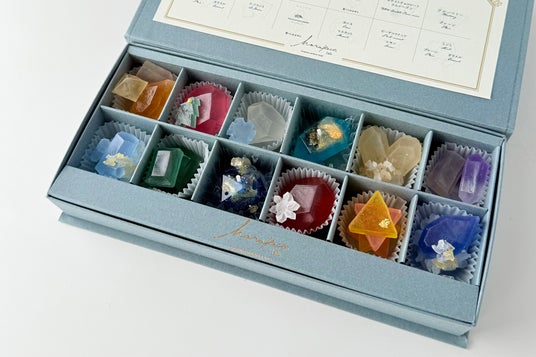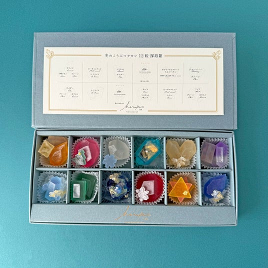 冬のきらめきを閉じ込めた冬季限定の琥珀糖と鉱物キャンドルのセットが登場。赤いカシスのルビー、ホワイトチョコとラムレーズンが香る水晶、カラメルのトパーズ、雪を纏ったサファイア、精巧なカッティングが輝くダイヤモンド。神秘的な宝石と冬のモチーフを、職人がひとつひとつ切り出し、シャリッと口の中で儚く溶ける和菓子、琥珀糖で表現しました。箱の中央には、12月の誕生石ラピスラズリとターコイズをモチーフにした鉱物キャンドルが入っています。自然の造形美を蝋で表現するキャンドル作家polepolecandleworks に特別に制作していただきました。キャンドルにあかりを灯して、素敵な時間をお楽しみいただけます。特別な方への贈り物への冬の贈り物にもぴったりの、12粒入りのブルーグレーのお箱にゴールドのリボンをかけてお届けします。クリスマスカード1枚付き。