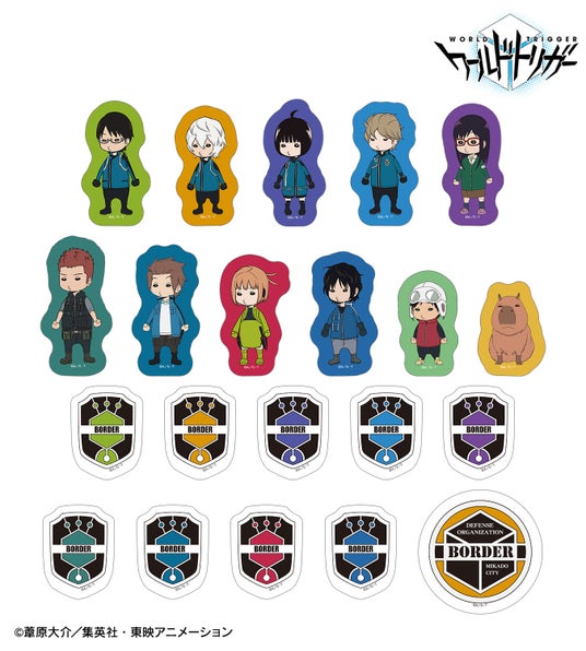 三雲 修、空閑 遊真、雨取 千佳、ヒュース、宇佐美 栞、木崎 レイジ、迅 悠一、小南 桐絵、烏丸 京介、林藤 陽太郎、雷神丸のイラスト、エンブレムをフレークシールに仕上げました。