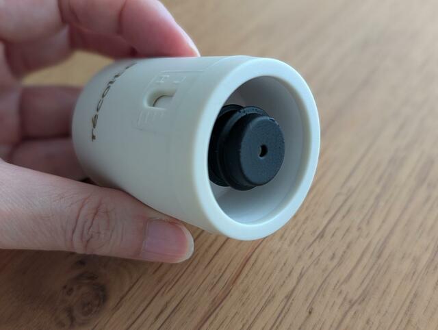 内部の栓はシリコン製。高さ約5.7cm、幅約4.2cmと、コンパクトなサイズ感なので、キッチンの引き出しに入れても収納場所をとりません。