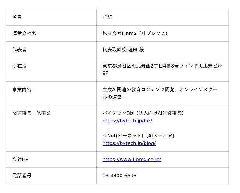 株式会社Librex(リブレクス)(本社:東京都渋谷区、代表取締役:塩田 稜、バイテック生成AIオンラインスクール運営)は、受講生の学習成果を可視化・証明する新制度として、「スキル証明課題」の提供を2025年12月16日より開始しました。